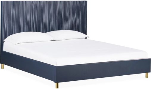 This modern glam bedroom pairs organic shapes with sharp minimalist edges in a showcase of navy blue and brass. Tight, straight grained oak veneer provides natural texture under the thick and rich navy finish, activated by round brass accents on the legs and pulls.Read More