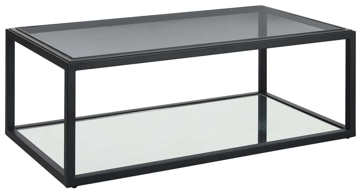 Panes of smoked glass are set flush with a raised gunmetal frame for a subtle step effect while a black metal base and mirrored shelf provide subtle contrast. Complementary materials and color tones result in a nuanced but monochromatic look versatile enough to make it home in any living space.Read More