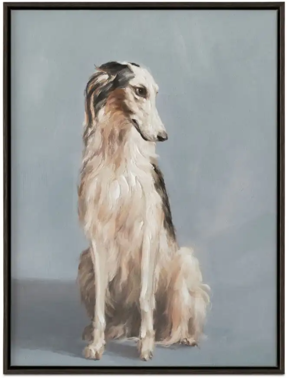 Because every room needs a familiar face. This softly brushed portrait captures a dog mid-daydream—calm, content, and quietly charming. Framed in solid wood with a subtle blue finish, it leans traditional with an art deco ease. Muted tones and delicate strokes keep the mood warm and lived-in.Read More