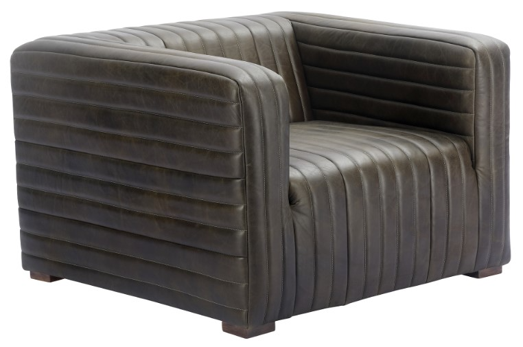 Castle is defined indulgence ideal for the living room, den or office. This chair sits firmly in its blocked uncomplicated industrial style and channeled top-grain leather.