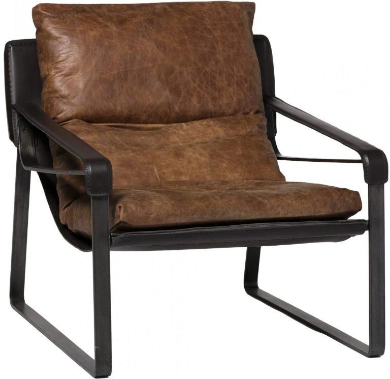 A sleek and robust iron frame imparts an industrial edge to the smooth brown leather - a harmonious blend of sculptural allure and leisurely comfort.