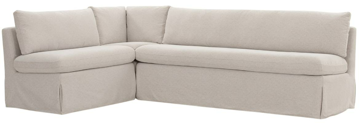 The Fable slipcover dining banquette L-shape's snug-fitting, washable slipcover with inverted pleats offers a tidy appearance and effortless upkeep. A slight tilt encourages a relaxed seating posture with a pillow back and seat cushions for comfort.Read More