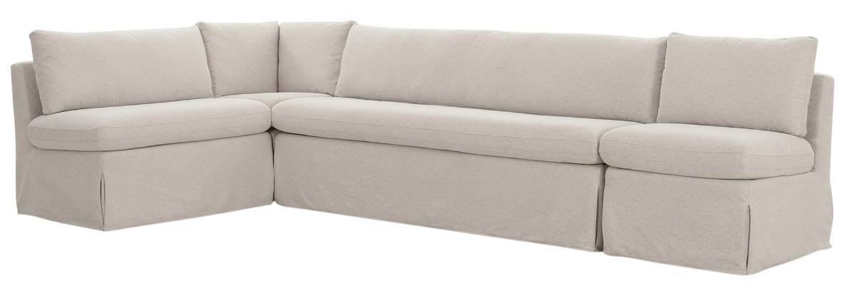 The Fable slipcover dining banquette L-shape's snug-fitting, washable slipcover with inverted pleats offers a tidy appearance and effortless upkeep. A slight tilt encourages a relaxed seating posture with a pillow back and seat cushions for comfort.Read More