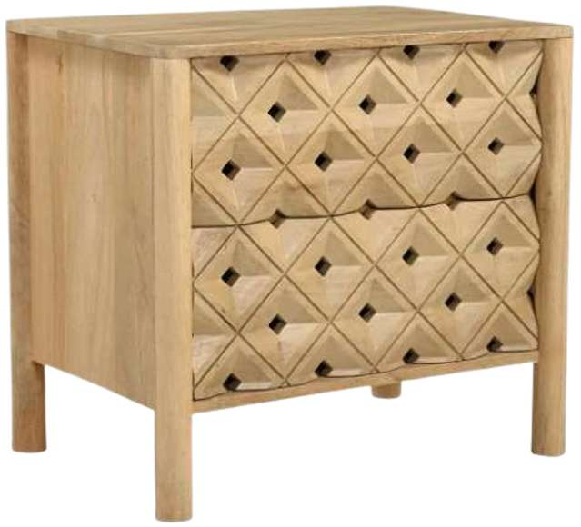 Carved from solid mango wood, the Fulton nightstand’s geometric, off-centered front creates a striking focal point. Two push-to-open drawers offer effortless functio nality. The natural finish showcases the wood's rich grain, celebrating its inherent beauty.Read More