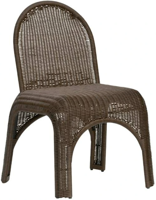 Contemporary take on a wicker chair with over exaggerated curves and rounded back rest