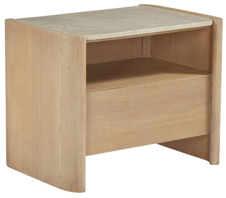 The Lane nightstand captures the essence of Scandinavian modern design. Its sleek, solid oak frame is accented by thick, curved elements that soften its silhouette, allowing its inset Italian Botticino marble top to take centerstage as its rounded overhang gracefully complements its open and closed storage that features under-mounted glides.Read More