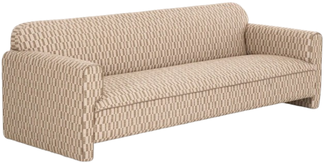 Curved Contours: Its squared side profile juxtaposes with inward-rolled arms and a gently curved back for an inviting silhouette