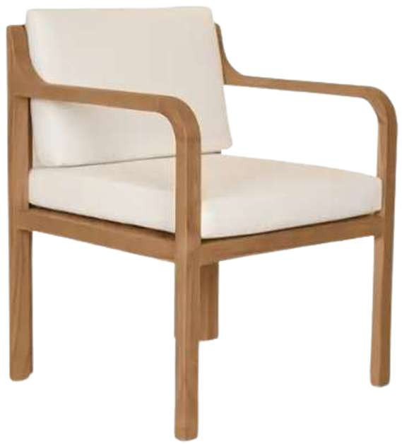 The Nellie outdoor dining chair elevates outdoor dining with comfort and enduring style. This foundational piece features a solid teak frame with quick-dry foam cushions upholstered in white 100% Olefin fabric. The curved back with gradually sloping arms creates a welcoming silhouette whose form is durable and weather resistant.Read More