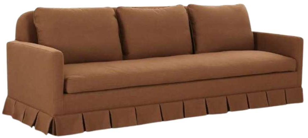 Box pleat skirt detail, minimal track arm. Back features soft rounded corners