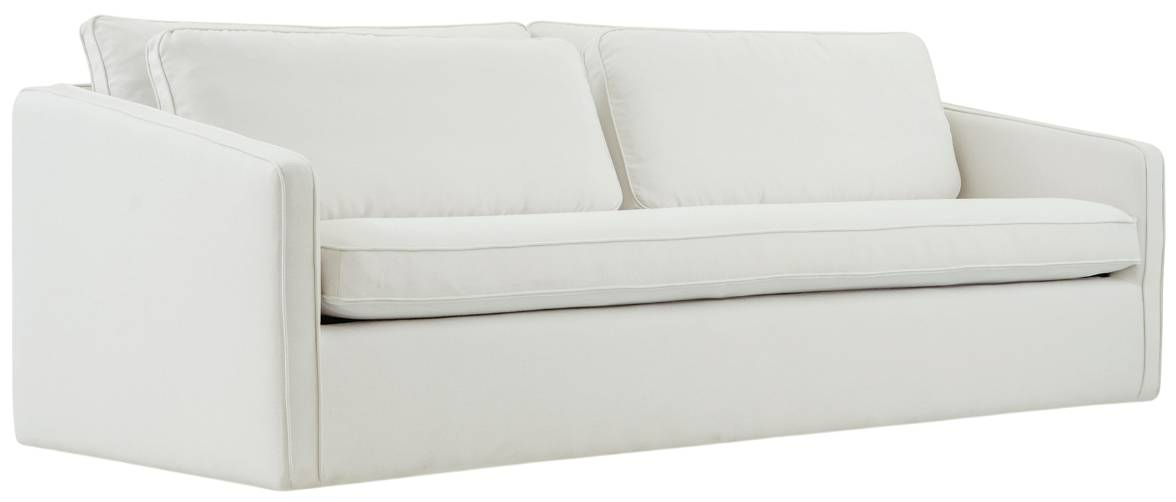 The Phoebe sofa in ivory embodies transitional elegance with its minimalist form and tapered arms. The linear form is softened by a plush, feather-topped bench seat. Delicate piping adorns the arms and layered back cushions, adding tailored finesse.Read More