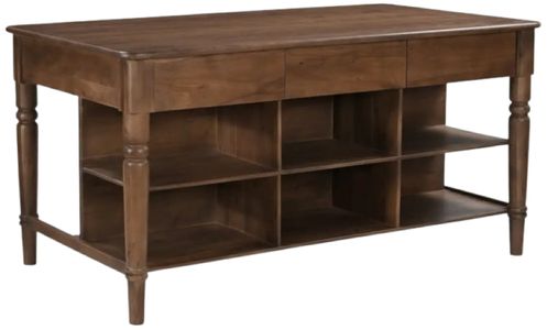 The Russet kitchen island features beautifully turned legs, intricately carved details, and a mid-tone brown finish that fits seamlessly into traditional and transitional homes. Adding to its charm are six open shelves and three drawers opposite the seating area. These are complemented by an overhanging tabletop that enhances its classic aesthetic--a timeless centerpiece.Read More