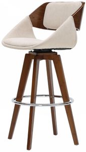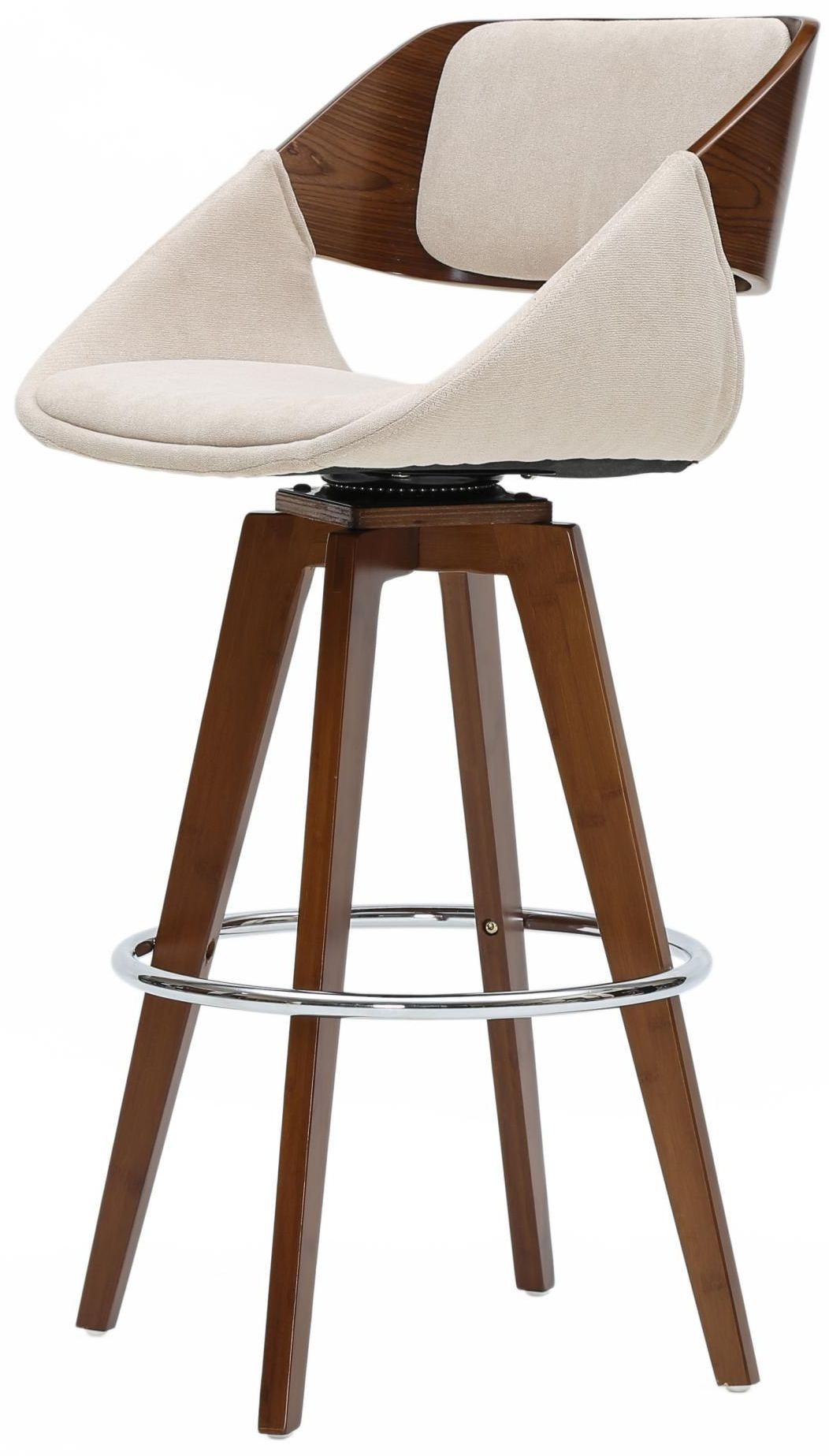 Chic Mid-Century 360-degree swivel counter stool features a cut-out back with walnut bentwood and soft fabric for the back and seat cushions.