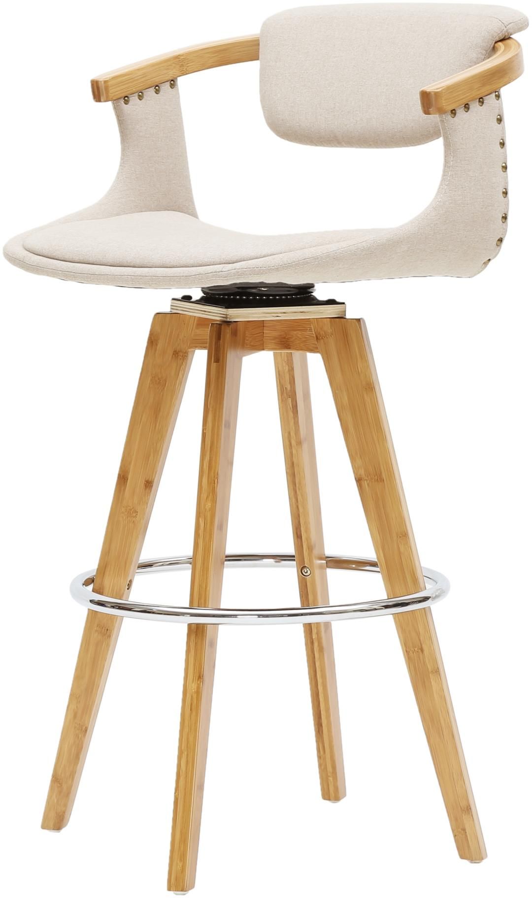 Chic Mid-Century 360 degree swivel 36" tall counter stool features natural bamboo material and soft beige fabric in back and seat cushion. Bronze nail heads trimming precisely placed by hand. A circular shape foot stretcher on bamboo legs provides stability and sturdiness.