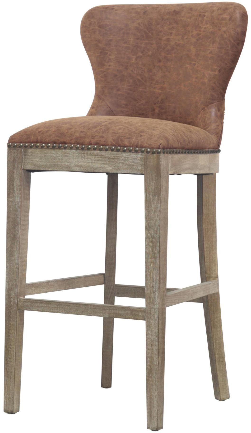 Set the tone for your home bar or pub table with the Dorsey Bar Stool. With its distressed polyurethane leather and the Driftwood legs, it will fit right into any transitional or contemporary setting. Wing back style 30" height bar stool featuring Nubuck Charcoal faux leather upholstery with nailheads trim, foot rest bar for stability and rubber feet for scratch prevention.