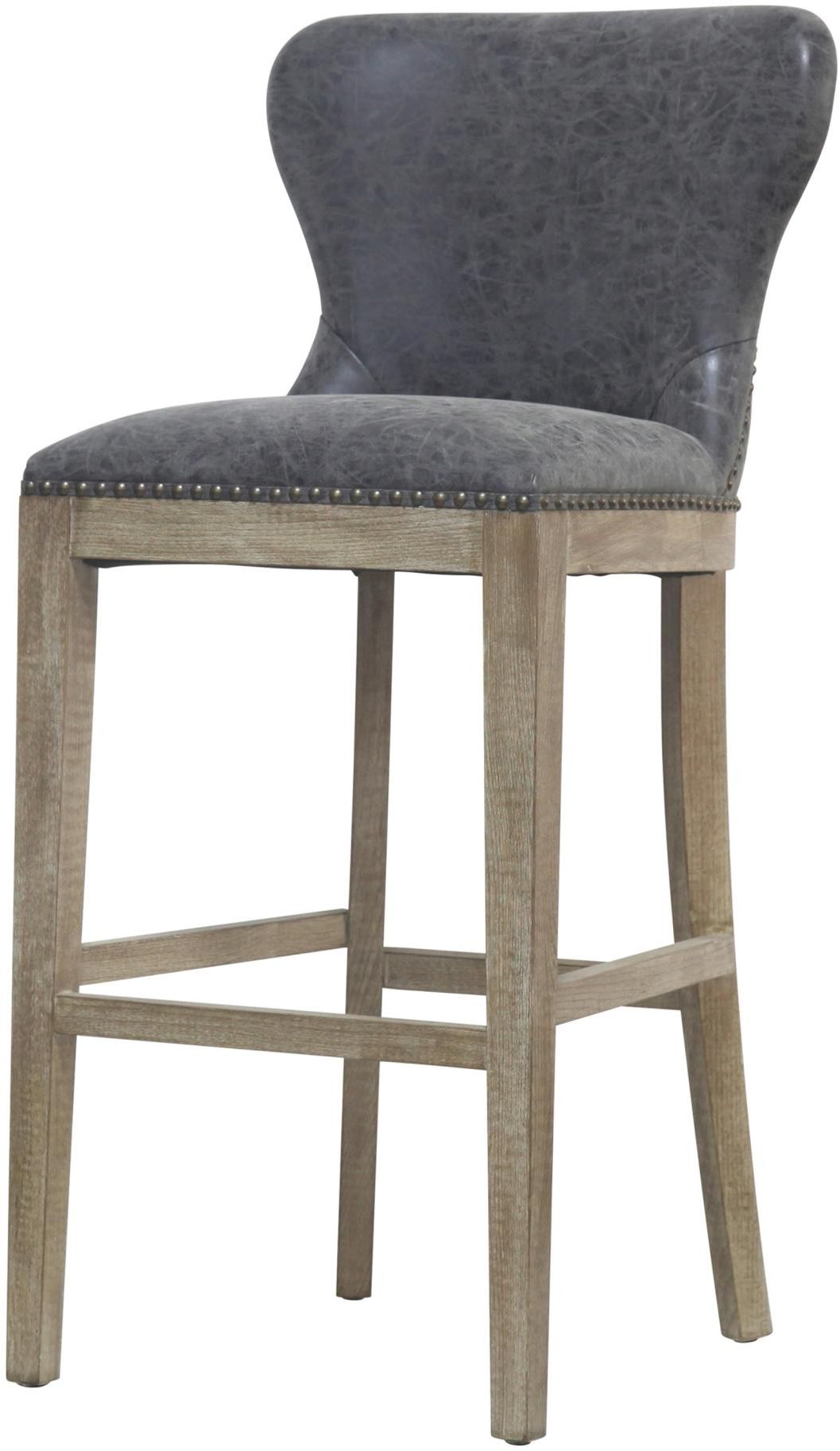 Set the tone for your home bar or pub table with the Dorsey Bar Stool. With its distressed polyurethane leather and the Driftwood legs, it will fit right into any transitional or contemporary setting. Wing back style 30" height bar stool featuring Nubuck Charcoal faux leather upholstery with nailheads trim, foot rest bar for stability and rubber feet for scratch prevention.