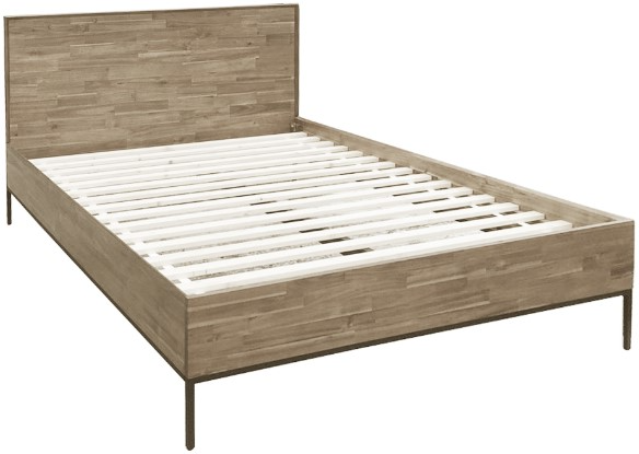 Rustic modern in 63" width queen size bed -- features tiled pattern for the headboard made of solid acacia wood. The legs are sturdy powder coated steel. For mattress stability, 16 wooden slats are made of solid pine wood. Plastic glides are installed for safety and stability.