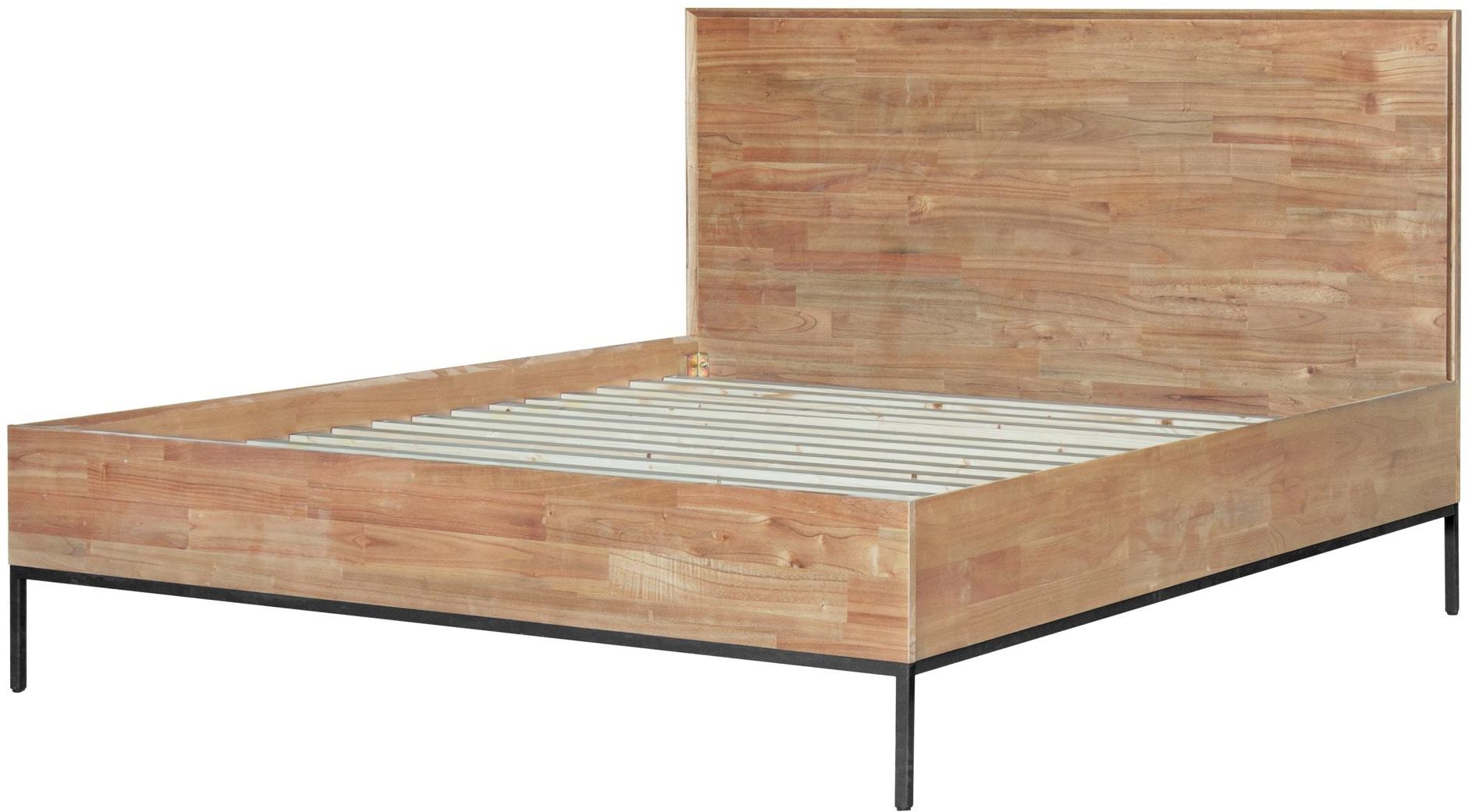 Rustic Modern line bed set constructed of solid Mindi wood in a tiled arrangement headboard, propped on minimalist powder-coated steel legs. Includes 16 slats made of Pine Wood for mattress stability.