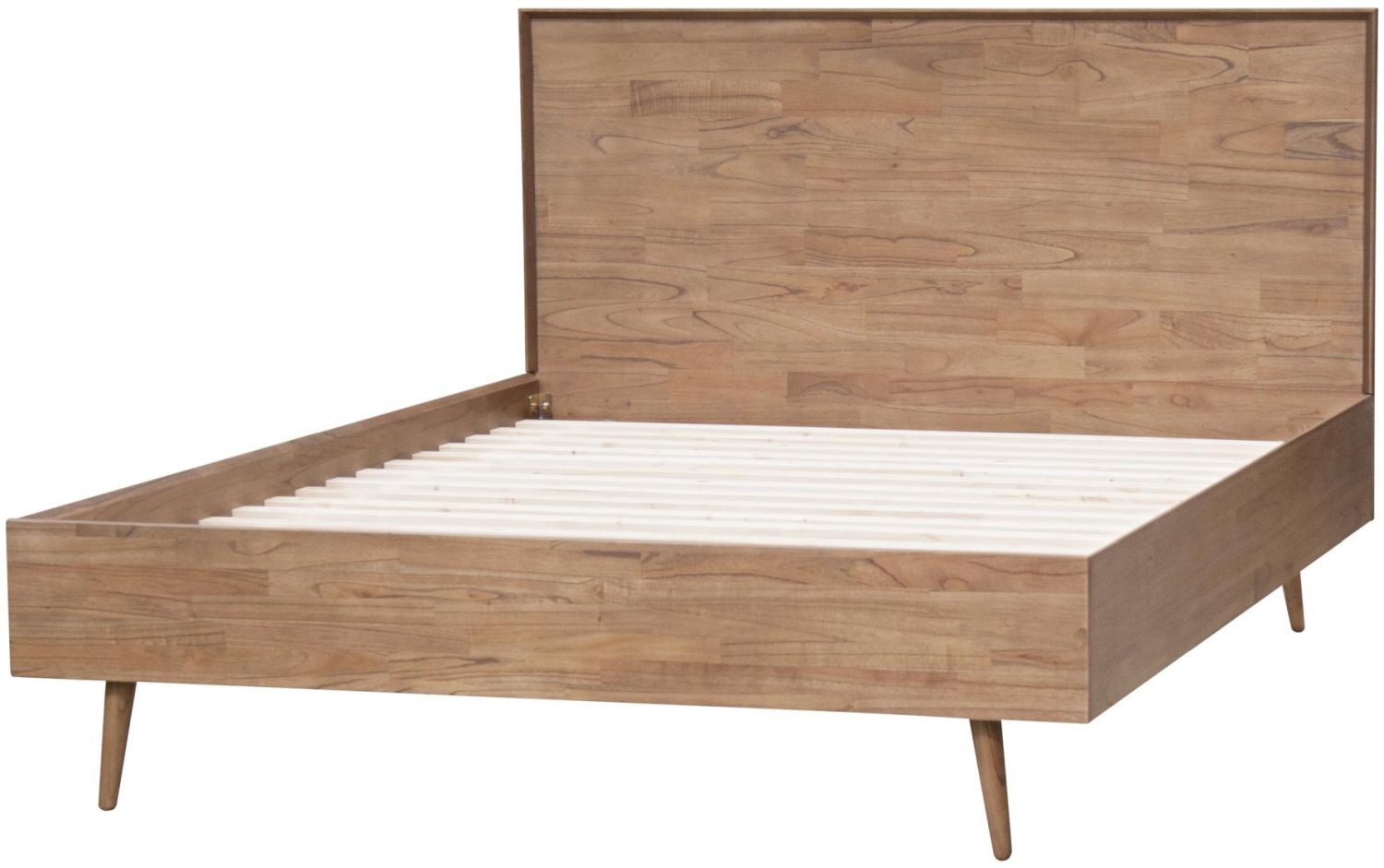 Rustic Mid-Century Modern bed set constructed of solid Mindi wood in a tiled arrangement headboard, propped on splayed legs. Includes 16 slats made of Pine Wood for mattress stability.