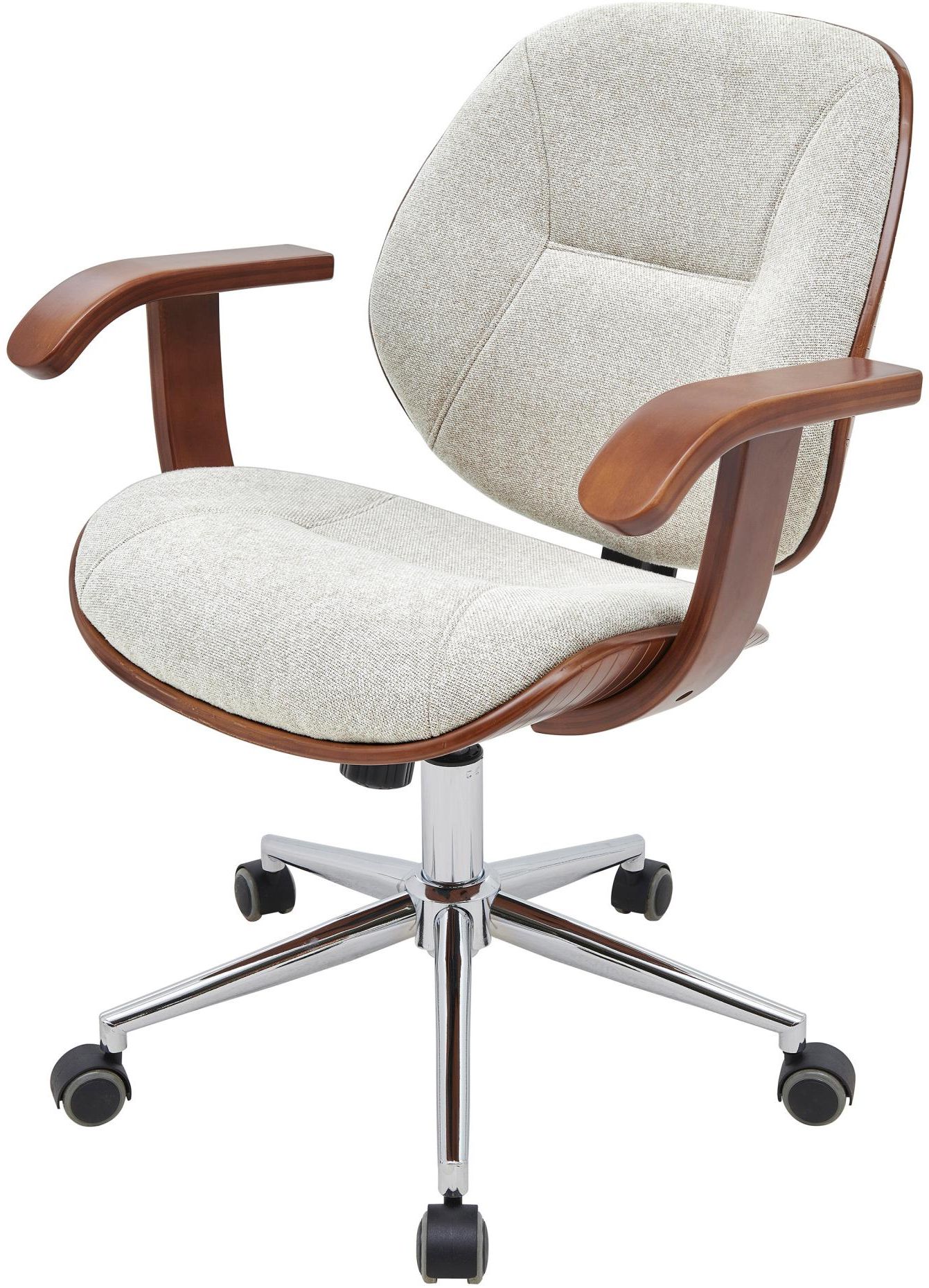 In the Mid-Century vibe, the Samuel Office Chair conveys a feeling of executive confidence with a 1950s look. Features include tilt-lock function, adjustable seat height, 360-degree swivel, and chrome casters. The seat height adjusts from 18 inches to 21 inches. Assembly required, available in Black Faux Leather/Walnut and Havana Linen Fabric/Walnut.