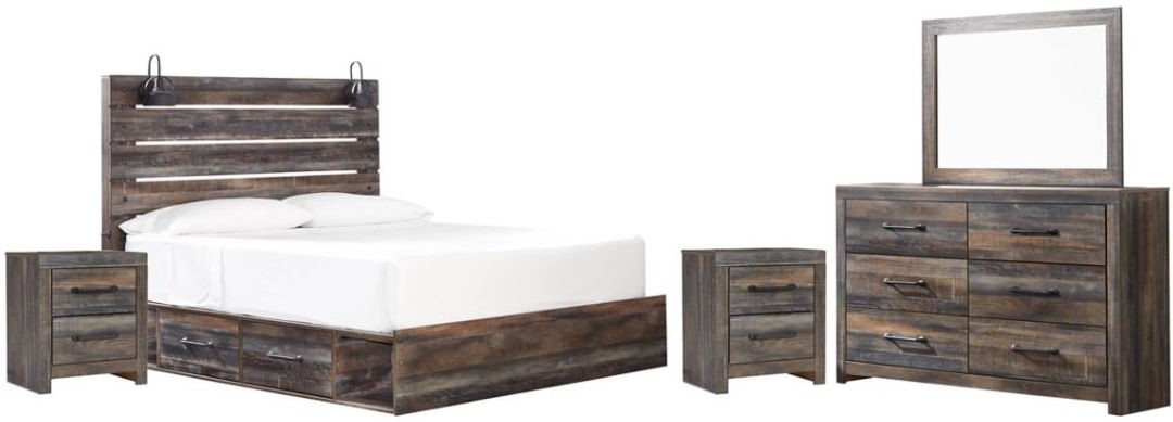 Includes bed (headboard, footboard, platform rails, side storage unit and wood roll slats), 6-drawer dresser with mirror and two 2-drawer nightstands