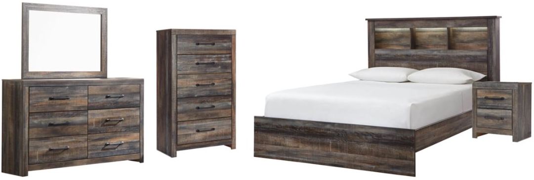 Includes queen bed (with bookcase headboard, footboard and rails), 6-drawer dresser with mirror, 5-drawer chest and 2-drawer nightstand