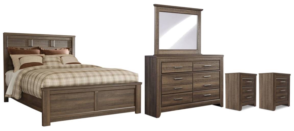 Includes panel bed (headboard, footboard and rails), 6-drawer dresser with mirror and two 2-drawer nightstands