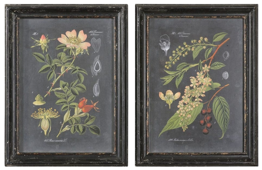 Transitional in style, these colorful, botanical prints evoke traditional scientific texts. Shades of peach, sage green, and red pop against the aged black background. Distressed wooden frames with a black finish, gray and taupe accents, and a heavy taupe glaze surround each piece of art.Read More